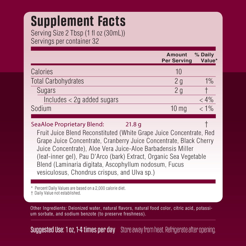 SeaAloe's unique blend of aloe vera, organic sea vegetables, pau d'arco extract, and the finest 4 fruit juices make it a more comprehensive dietary supplement compared to any single ingredient. Each ingredient supports body functions and delivers a full spectrum of essential nutrients often missing from our daily diets. SeaAloe is perfect for all ages and lifestyles, making it an excellent addition to any health regimen.